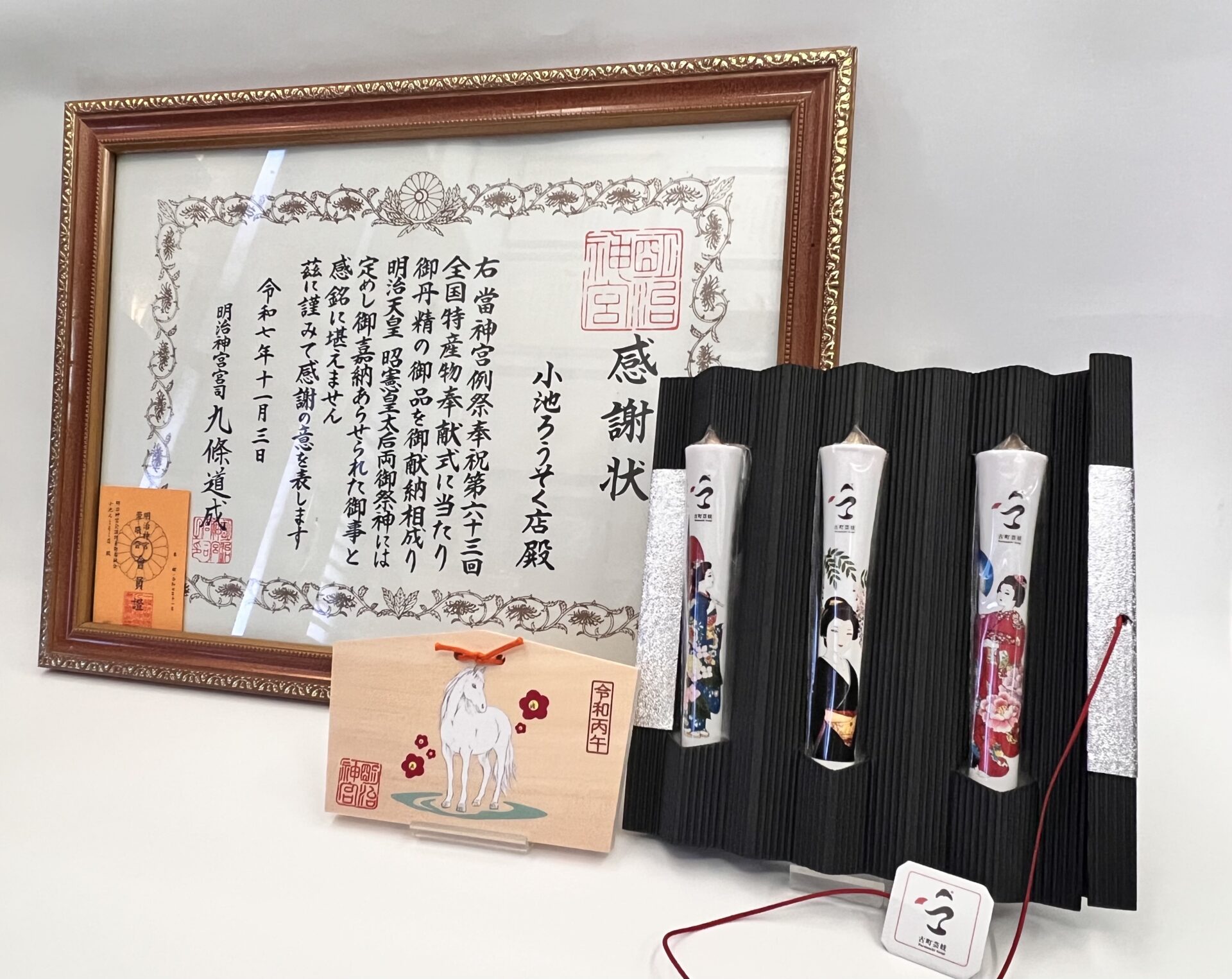 令和7年11月1日~3日に東京・ 明治神宮にて行われた「秋の大祭」にて、新潟の特産物として「柳都華絵巻ろうそく」を奉献致しました。新潟の伝統と文化、そして「古町芸妓」を新潟の魅力として発信できたことを光栄に思います。