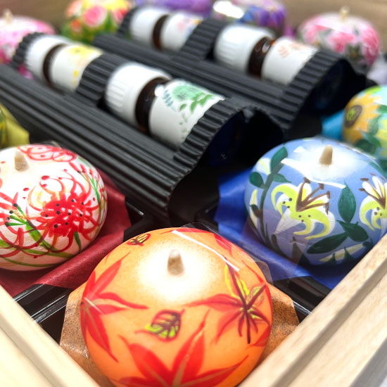 手描き花丸ろうそくの全12種類と和香オイルを桐箱のギフトに詰めました。